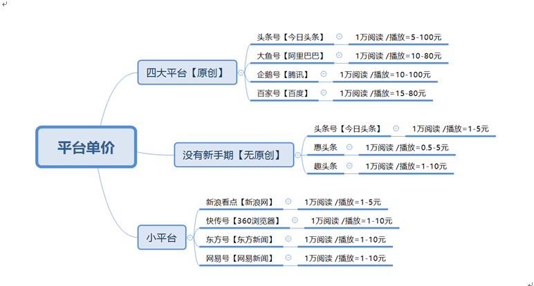 那我们的一个收益计算又是怎样的呢,就是当我们注册一个自媒体账号之后,平台是给我们自媒体创作者一个单价的,每个平台的单价都是不一样的,也是不固定的,也是需要我们创作者需要打造提升的,那具体单价是怎样的,部分平台单价可以看下图: