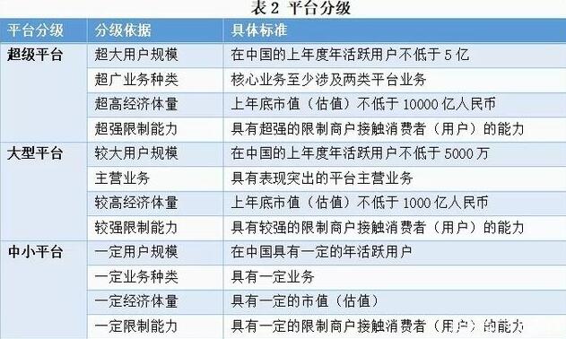 将互联网平台分为以下三级:超级平台、大型平台和中小平台。其中,超级平台在中国的上年度年活跃用户不低于5亿、核心业务至少涉及两类平台业务、上年底市值(估值)不低于10000亿人民币、具有超强的限制商户接触消费者(用户)的能力;大型平台在中国的上年度年活跃用户不低于5000万;中小平台在中国具有一定的年活跃用户。