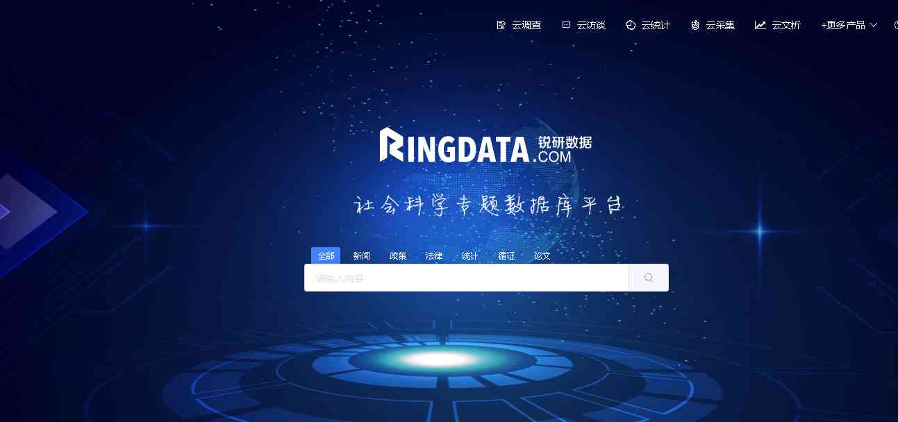 锐研数据社会科学专题数据库平台是面向社会科学研究的数据资源检索和科研工具辅助平台,可满足社会学、法学、新闻传播学、政治学、管理学、经济学、历史学、心理学、语言文学、哲学等人文社会科学学科的科研数据需求。锐研社会科学专题数据库包括来自互联网的中文新闻报道、各级政府公开的政策和行政法令、各级政府公开的各类统计调查数据、循证社会科学研究证据和科研成果、基于同行推荐的精品社会科学核心期刊论文索引等。专题数据库还可提供基于大数据文本挖掘和可视化技术的指数查询数据库,包括新闻指数、政策指数和学术指数查询。 1、锐研中文新闻数据库(RINGDATA-CND) 中文新闻数据库包括国内外所有中文新闻报道索引,提供新闻内容主题分类,从新闻中提取时间、地点、人物、机构、主题、情感、影响力等各类结构化变量。新闻数据来源覆盖国家网信办公布的可供新闻转载的380家新闻单位(含报纸和网站)、各级省市的地方媒体等。可按主题、时间、来源进行分类筛选。提供新闻可视化分析和新闻指数查询工具。 2、锐研政策研究数据库(RINGDATA-PRD) 政策研究数据库覆盖所有中央行政单位、各省行政单位、各地级市行政单位公开的各类政策文件文本; 政策文本包括政策文件名称,政策类型、发文文号、颁布部门、效力级别、时效性、颁布日期、实施日期、 内容主题等多个变量;政策类型包括决议、决定、命令、公报、公告、通告、意见、通知、通报、报告、 请示、批复、议案、函、纪要等。 3、锐研法律法规数据库(RINGDATA-LRD) 锐研法律法规数据库包括建国以来的国家相关部门颁布的各类法律法规文本,包括法律、行政法规、司法解释、部委规章、地方性法规、地方司法解释、地方政府规章共七个类别,并提供对法律法规文本的主题分类和结构化检索。 4、锐研社会统计调查数据库(RINGDATA-SSD) 社会统计调查数据库提供国内互联网公开的各类开放数据集索引, 数据来源包括国家统计局、各级地方政府的数据开放平台,数据库提供的数据集的索引目录、 下载地址和结构化元数据。数据集涉及经济、环境、社会、文化、人口、教育等多个主题的数据集。 5、锐研循证社会科学数据库(RINGDATA-ESS) 循证社会科学数据库涵盖中国社会科学领域各类循证实践证据索引,涉及社会工作、心理学、教育管理、司法矫正、决策管理、环境健康等多个领域。证据的分类包括方法汇总、定性研究、案例研究、对照研究、随机对照研究、系统评价、指南及手册等。证据内容包括标题、作者、发表时间、研究类型、摘要、关键词以及全文链接等关键字段,可按关键词组合、PICOS等方法进行高级检索。 6、锐研精品社科论文数据库(RINGDATA-SPD) 锐研精品社科论文数据库以核心期刊论文为基础,通过大规模学术同行推荐的方式,遴选出优秀社会科学论文若干,形成精品社科论文数据库。精品社科论文数据库致力于发掘优秀的社科论文和社会科学研究热点和问题,构建面向社会科学研究主题的知识图谱,为社会科学学者提供个性化的知识服务。 7、锐研指数查询数据库(RINGDATA-RI) 锐研指数查询数据库提供对新闻指数、政策指数、学术指数的查询分析。可根据数据库主题、数据来源类型按关键词查询词频、文章数量等指标随时间范围的变化,可按年、按月、按日进行统计分析;关键词可以进行组合查询,支持关键词的并且、或者、不包含、括号等复杂组合规则;多个关键词或关键词组合可进行对比分析。 数据库文献数量和收录年限 1、锐研中文新闻数据库:时间跨度2000年至今,现有结构化数据1亿余条,年新增数据3000万。 2、锐研政策研究数据库:时间跨度2000年至今,现有政府公文200余万条,年新增20万。 3、锐研法律法规数据库:时间跨度1949年至今,现有法律文本50余万条,每年增量更新。 4、锐研统计调查数据库:时间跨度2000年至今,数据库现有数据5万,年新增1万。 5、锐研循证社会科学数据库:时间跨度2000年至今,时间跨度2000年至今,现有数据10余万,年新增数据2万。 6、锐研精品社科论文数据库:时间跨度2010年至今,现有数据80万,年新增8万。 7、锐研指数查询数据库:时间跨度2000年至今,支持任意关键词及组合查询。